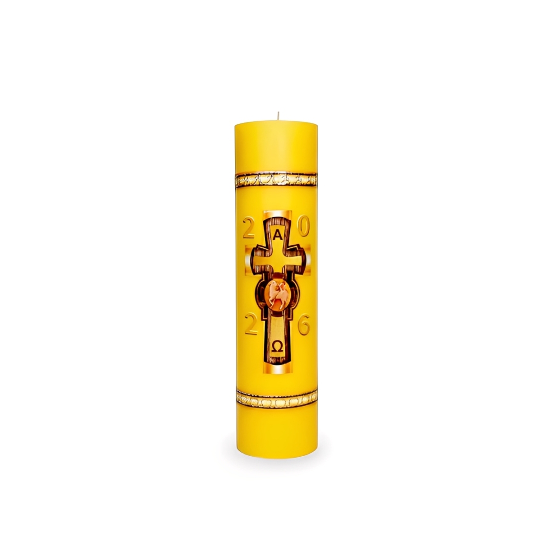 Contem :1 Círio Pascal 2026, no tamanho de 30cm de altura por 7,8 cm de diâmetro, Com aplique adesivo.